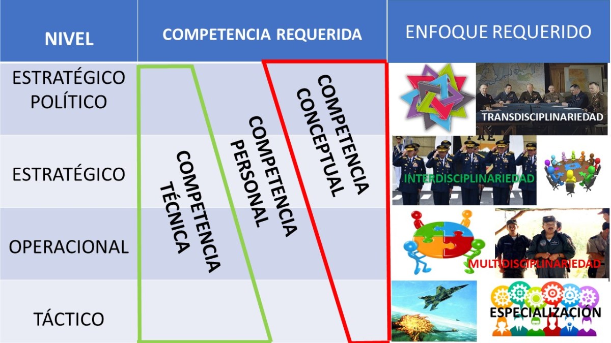 21. Es un análisis muy interesante de la gestión organizacional por procesos, que en el caso de nuestra Institución Armada lleva 12 años con este modelo organizacional, por lo que es necesario realizar una evaluación integral de de manera técnica y objetiva, para verificar si efectivamente responde a nuestra realidad, a lo que los diferentes repartos están cumpliendo, y más aún en la época actual donde debemos cumplir nuevas operaciones orientadas al ámbito interno. Coincido plenamente, que las Fuerzas Armadas mantiene niveles claramente definidos, donde definitivamente se requiere evolucionar desde lo multidisciplinario hacia un enfoque interdisciplinario y luego transdisciplinario en forma progresiva conforme suben los niveles de la organización, de acuerdo al siguiente detalle: desde el Táctico donde se tiene una competencia conceptual de especialización, en el nivel Operacional donde ya se requiere articular y mantener una coordinación entre diferentes competencias, con un enfoque de multidisciplinariedad, el nivel Estratégico donde se requiere restructurar disminuyendo la competencia táctica y aumentando la competencia conceptual donde resalta un enfoque de Interdisciplinariedad, y en el nivel Estratégico-Político donde se requiere una alta competencia conceptual con una menor competencia técnica resaltando el enfoque de transdisciplinariedad.