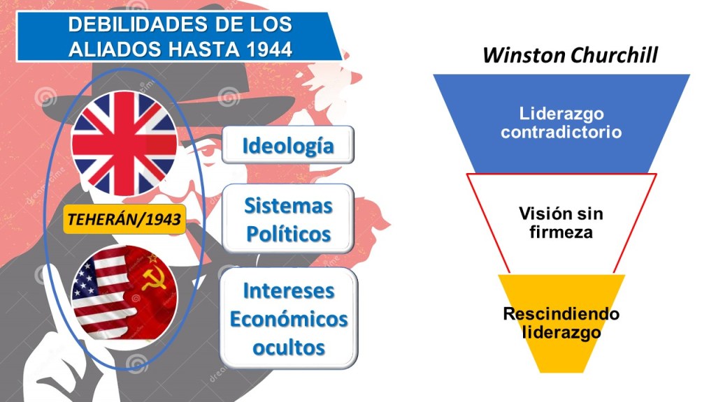 Previo al ingreso de Estados Unidos y Rusia en la II Guerra Mundial, Winston Churchill como Primer Ministro de Reino Unido, tenía la gran responsabilidad de ejecutar la política nacional de guerra, que termine con la ambición hegemónica de Hitler en Europa occidental. Pese a la necesidad de mantener la supremacía británica en la Europa continental y en las colonias de África y Asia, resguardando así los intereses nacionales; el “liderazgo contradictorio” (Gavaldá, 2020) de Churchill, influyó drásticamente en los resultados ambivalentes de la guerra para Reino Unido, demostrándose en ciertas máximas de Churchill, como “el éxito(…), consiste en ir de fracaso en fracaso sin perder el entusiasmo” (Martínez, 2020), que su visión política carecía de firmeza, hecho que se reflejó en las conversaciones previas al desembarco de Normandía, mantenidas en Teherán con los presidentes de los Estados Unidos y la Rusia.
