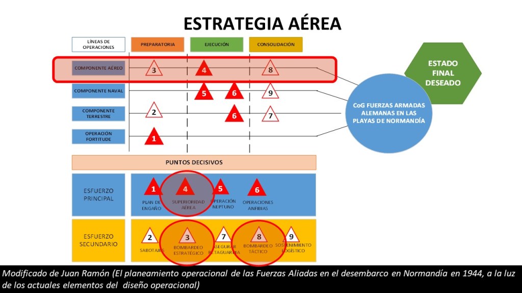 Aplicando los conceptos del Diseño Operacional (D.O.) a la Operación Overlord, una de las líneas de operaciones que se consideró fue el componente aéreo, donde la ejecución, antes, durante y después de las acciones del Día D, se pueden identificar las siguientes tareas: