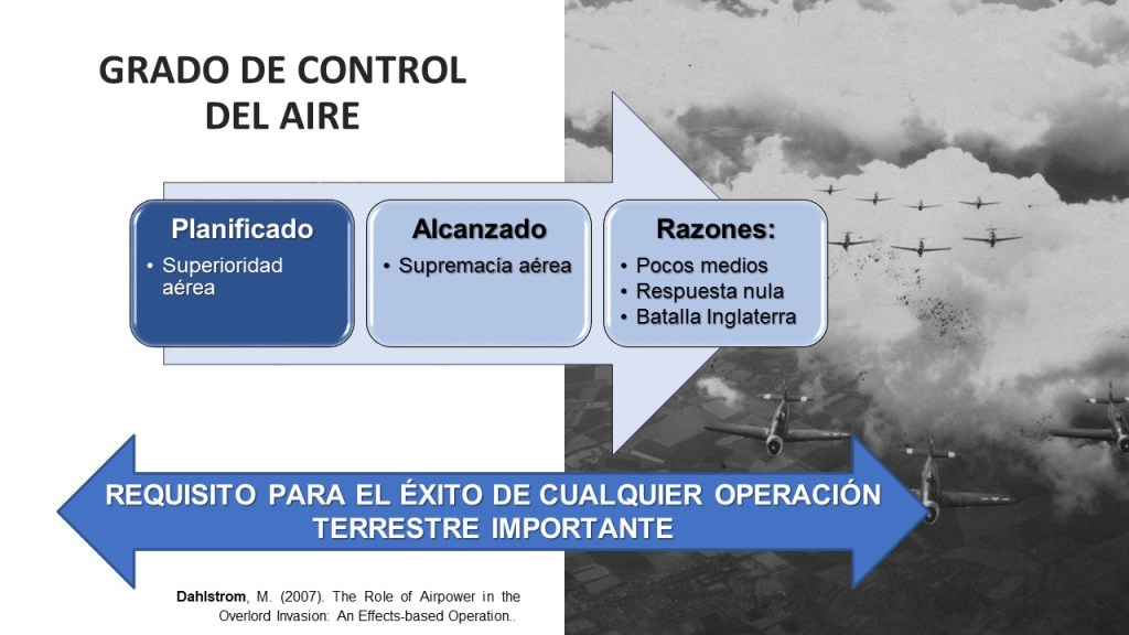 La combinación de campañas y operaciones permitió alcanzar una supremacía aérea por parte de los aliados, condición planificada inicialmente como superioridad aérea conforme a la doctrina de aquel entonces que la consideraba “como un requisito para el éxito de cualquier operación terrestre importante” (Dahlstrom, 2007). Dentro del D.O. la superioridad área se considera un punto decisivo de esfuerzo principal, a fin de brindar la condición de libertad de acción por parte de los aliados para continuar creando el tempo sobre las líneas alemanas hasta alcanzar su derrota.