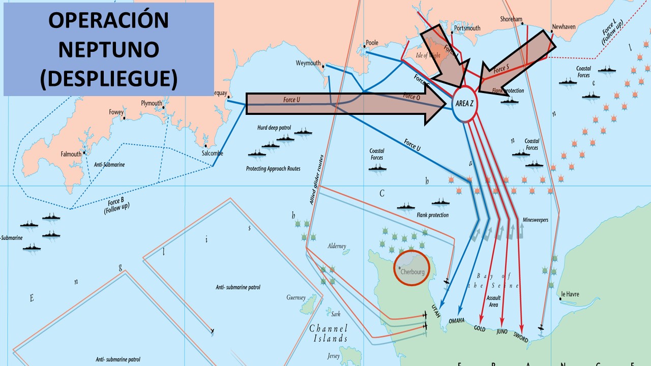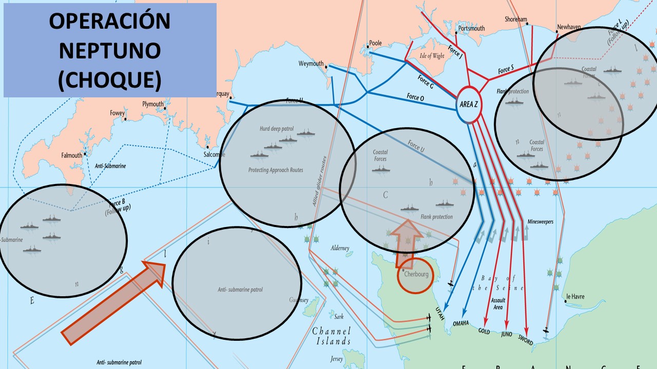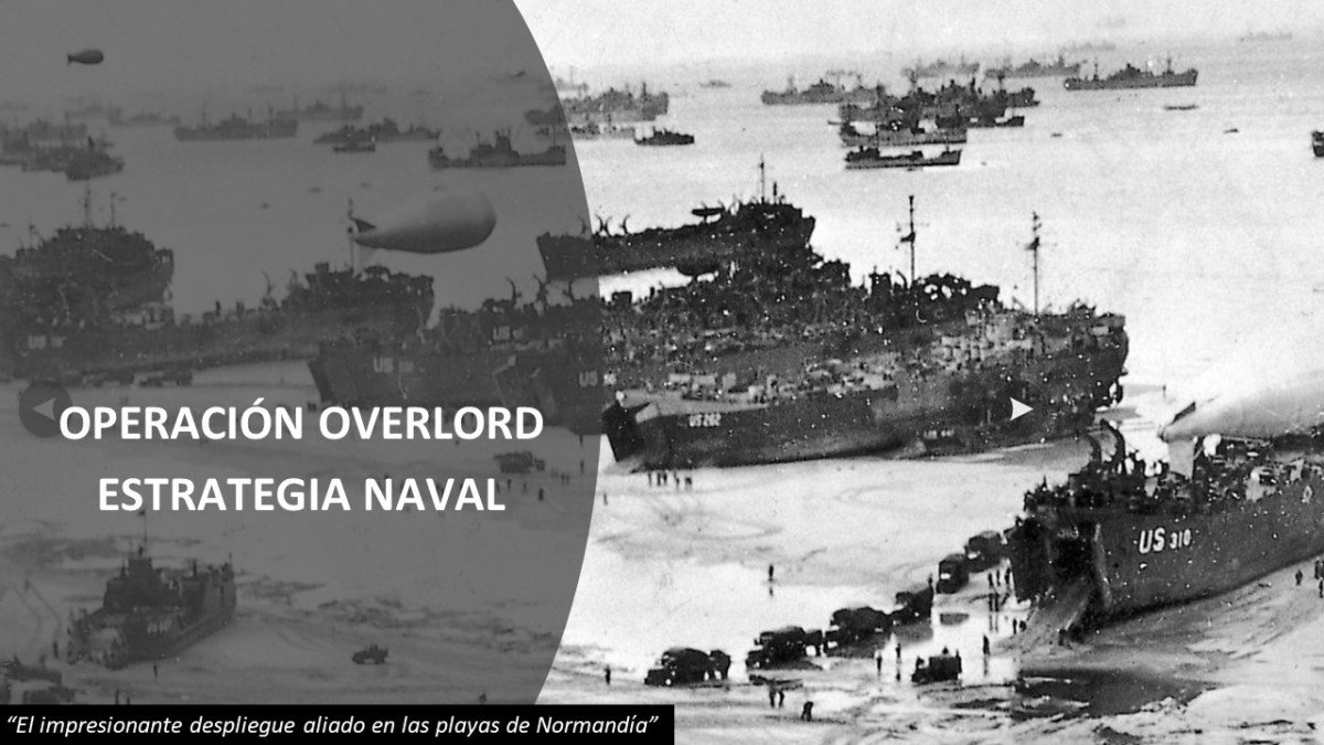 El artículo destaca las operaciones navales ejecutadas por las fuerzas aliadas y alemanas en la Operación Overlord, explicando las acciones de la maniobra estratégica naval planificadas y cumplidas.