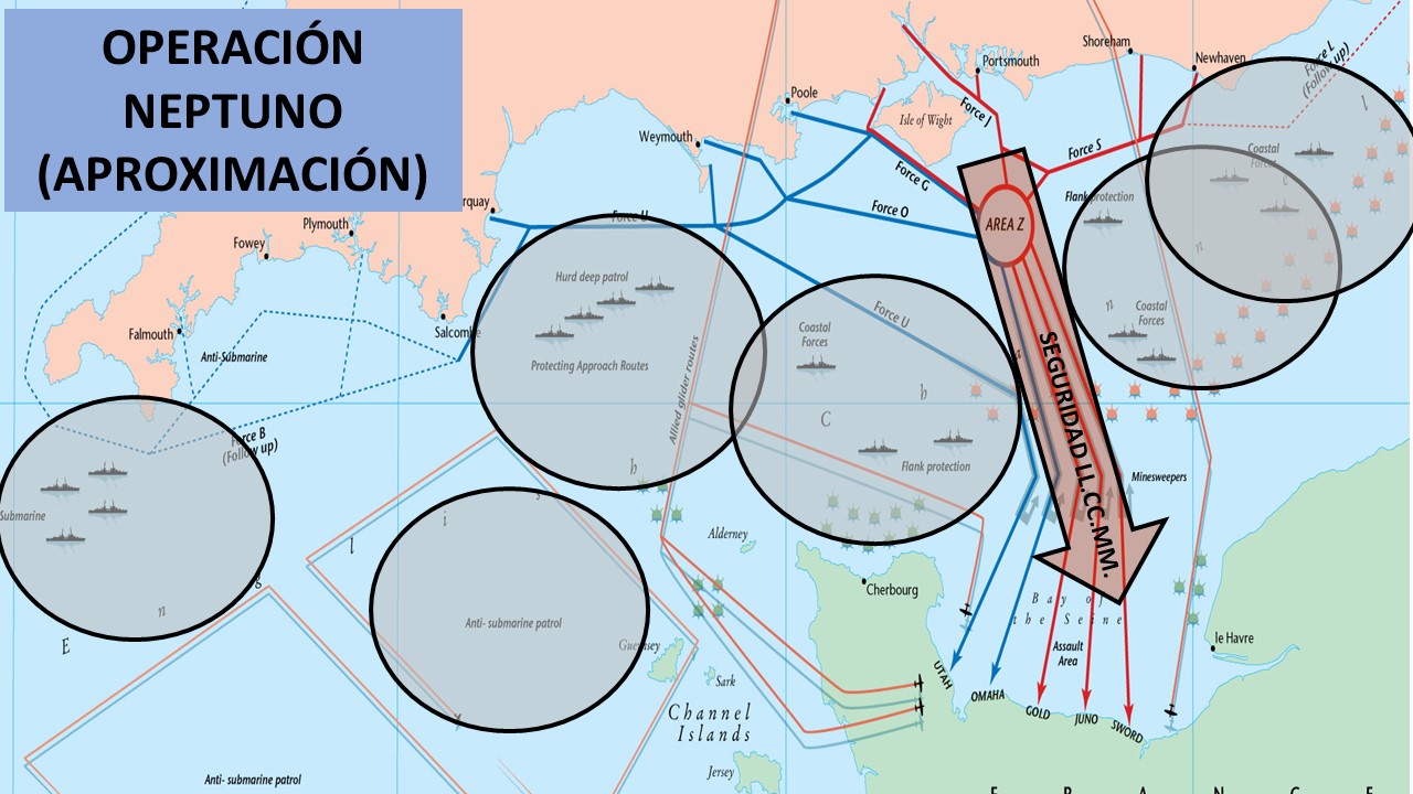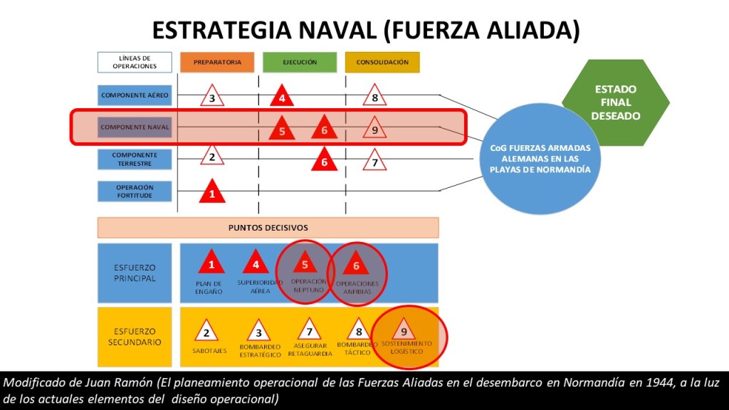 Aplicando los conceptos del Diseño Operacional (D.O.) a la Operación Overlord, una de las líneas de operación que se cumplieron fue la del componente naval, que recibió el nombre de Operación Neptuno, concebida con una actitud estratégica ofensiva que se enmarca en los siguientes tipos de operaciones navales: constituye una operación de ejercicio del control del mar en el canal de la Mancha, garantizando la seguridad de la flota que utilizó las líneas de comunicación, cumpliendo con el punto decisivo del D.O., que corresponde al transporte de las 39 divisiones de las tropas aliadas, vehículos, equipos y abastecimiento, adicional se cumplió con el sostenimiento logístico desde los puertos ubicados al sur de Gran Bretaña hasta las playas de Normandía, determinado como un punto decisivo del D.O; frente a las playas se materializa una operación de proyección, a fin de coadyuvar al objetivo estratégico de invadir, neutralizar y defender las playas de Utah, Omaha, Gold, Juno, Sword, mediante el cumplimiento de operaciones anfibias. Por su parte Alemania, reaccionó ante la Operación Neptuno, con una actitud estratégica defensiva, mediante operaciones de defensa del litoral, realizando defensa contra la invasión y defensa de costas, a fin de impedir la ofensiva estratégica y rechazar la ofensiva táctica, apoyados con un campo de minas que se extendía desde la costa de Boulogne hasta la Bahía del Sena.