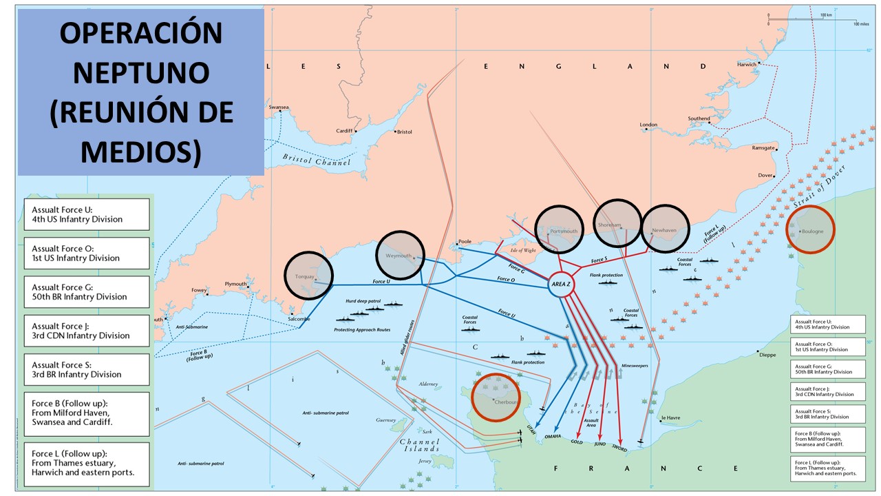 Las acciones de la maniobra de los dos bandos se describen a continuación: los aliados por la gran cantidad de embarcaciones (6.200 aproximadamente) la reunión de medios, se la realizó hasta el día 29-may-1944, en los puertos de: Torquay, Weymouth, Postsmouth, Shoreham, Newhaven ubicados al sur de Gran Bretaña.
