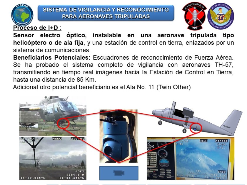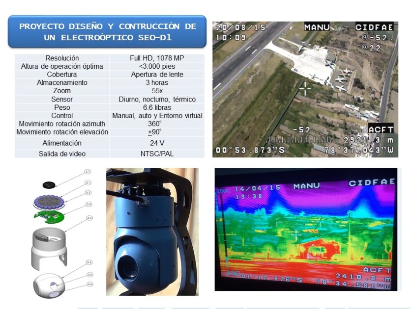 “El Sistema SEO-D1 cumplió con el proceso de validación utilizando como plataforma las aeronaves no tripuladas UAV-Gavilán, dando resultados que pueden ser aplicados en aeronaves tripuladas, razón por la cual se elaboró el Reporte de Ingeniería para la Instalación del Sensor Electróptico SEO-D1, en la aeronave DHC-6 Twin Otter FAE-448, mismo fue analizado y finalmente se cuenta con el Certificado de Aeronavegabilidad otorgado por la Dirección General de Logística de la FAE, el sistema fue probado en la ruta Latacunga- Lago Agrio-Latacunga; también se lo instaló en forma provisional el helicóptero Bell TH-57, y cumplió un vuelo de prueba Ambato-Quito-Ambato, con resultados favorables.”