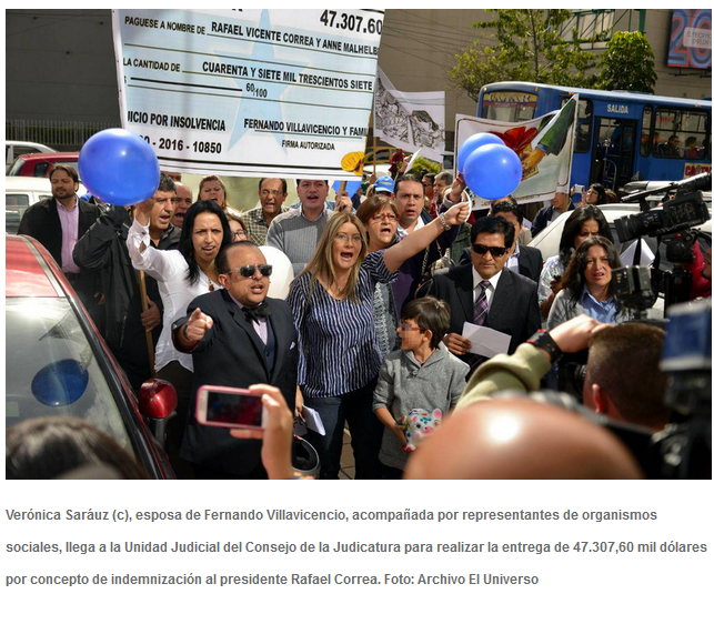 Verónica Saráuz (c), esposa de Fernando Villavicencio (+), acompañada por representantes de organismos sociales, llega a la Unidad Judicial del Consejo de la Judicatura para realizar la entrega de 47.307,60 mil dólares por concepto de indemnización al presidente Rafael Correa [9].