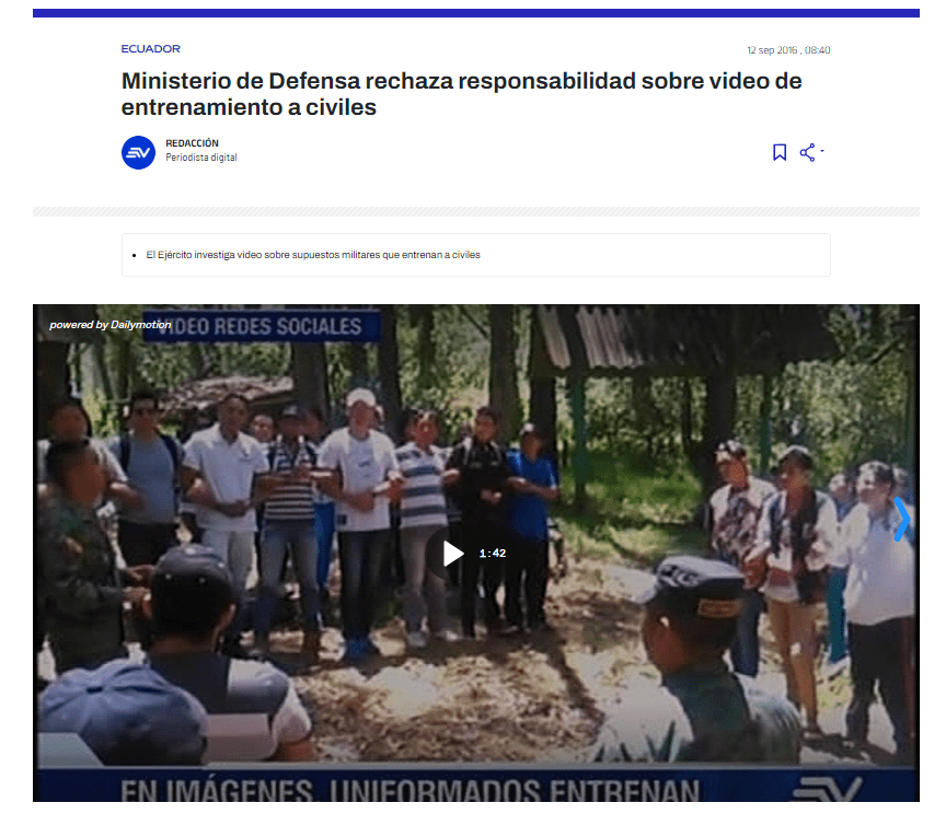 Ecuavisa en el mes de sept/2016, resaltaba la noticia de Ministerio de Defensa rechaza responsabilidad sobre video difundido en redes en donde se aprecia entrenamiento a civiles; días después el titular fue Fiscalía ya tiene los nombres de militares que aparecen en videos; con una justicia bajo control político el tema quedo en el olvido de quienes quieren olvidar… coincidentemente ese año llegaron de China 10.000 fusiles de asalto AK-47 entre las donaciones por el terremoto producido en Abril/2016… coincidencia???