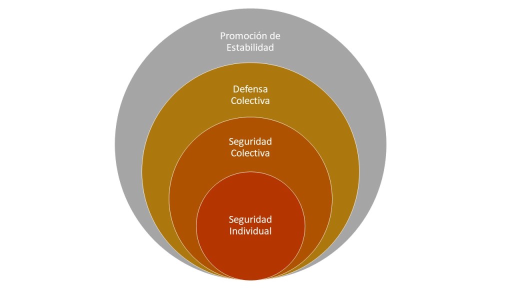 “Seguridad Individual (Seguridad Humana), orientada a la protección de la persona, estado y sus asociados. El segundo anillo, el de la Seguridad Colectiva, busca el mantenimiento de la paz entre los miembros del sistema. El tercer anillo, correspondiente a la Defensa Colectiva, es la protección mutua interestatal de la agresión externa. Y el cuarto anillo, la Promoción de la Estabilidad, se orienta al desarrollo de acciones para prevenir el surgimiento de factores de inestabilidad en la periferia del sistema.”