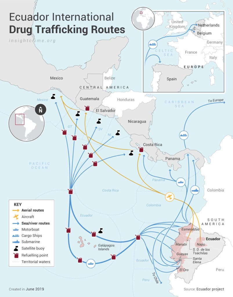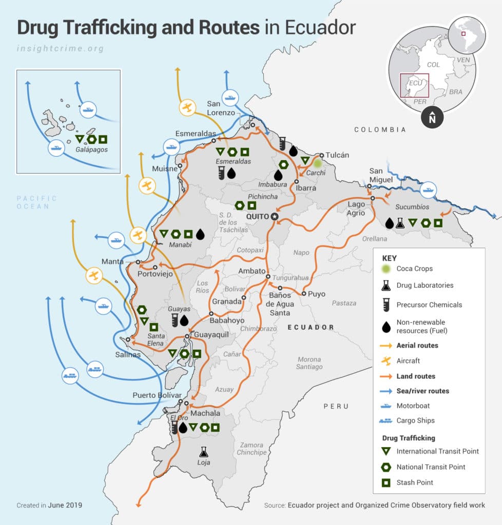Conforme a las estadísticas, más de un tercio de la producción de cocaína colombiana es traficada por puertos ecuatorianos hacia el mundo, requiriendo de una compleja red de almacenamiento y distribución para el tráfico al exterior y microtráfico. Como consecuencia inmediata, las organizaciones locales se disputan territorios con un notable incremento en la violencia y aunque las autoridades han podido identificar el accionar de algunas bandas delictivas comolos Choneros, (Cartel de Sinaloa), Lobos, Lagartos y Tiguerones (Cartel de Jalisco Nueva Generación), las acciones de la fuerza pública en contra de las mafias han sido limitadas, no solo por el marco jurídico existente sino además por la evidente influencia que manejan las bandas sobre los poderes del Estado, generando corrupción en el poder judicial, penitenciario, Policía Nacional y Fuerzas Armadas (Pichel, 2021).