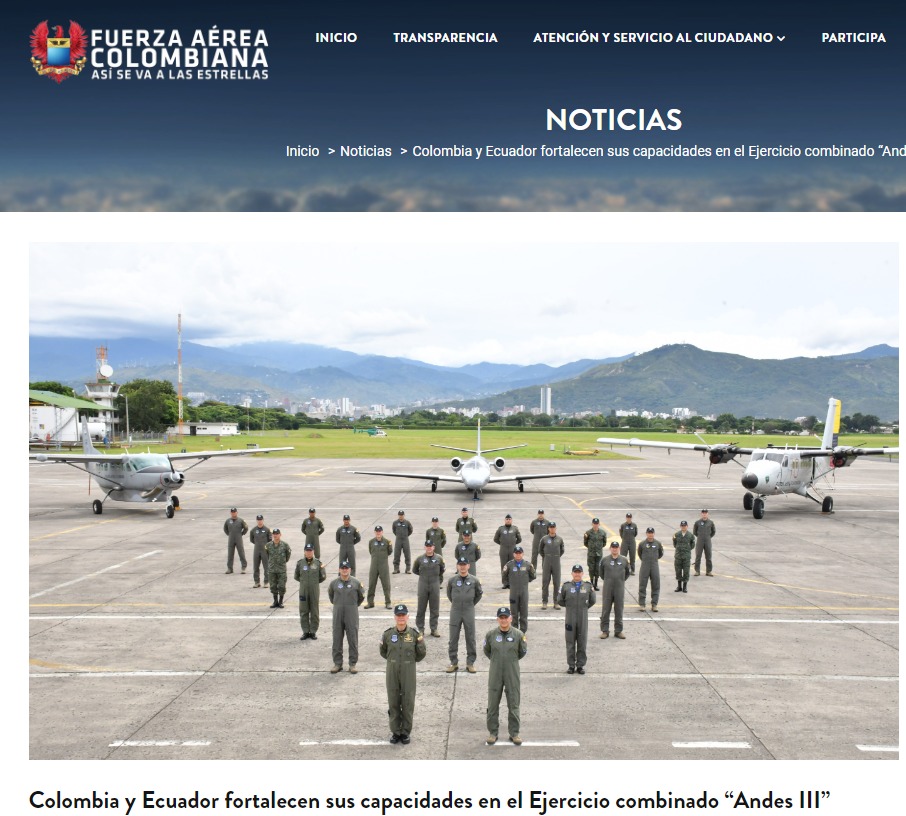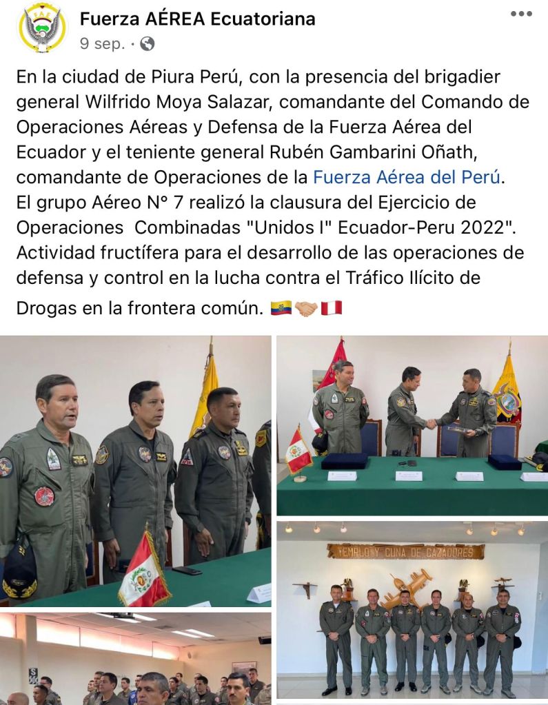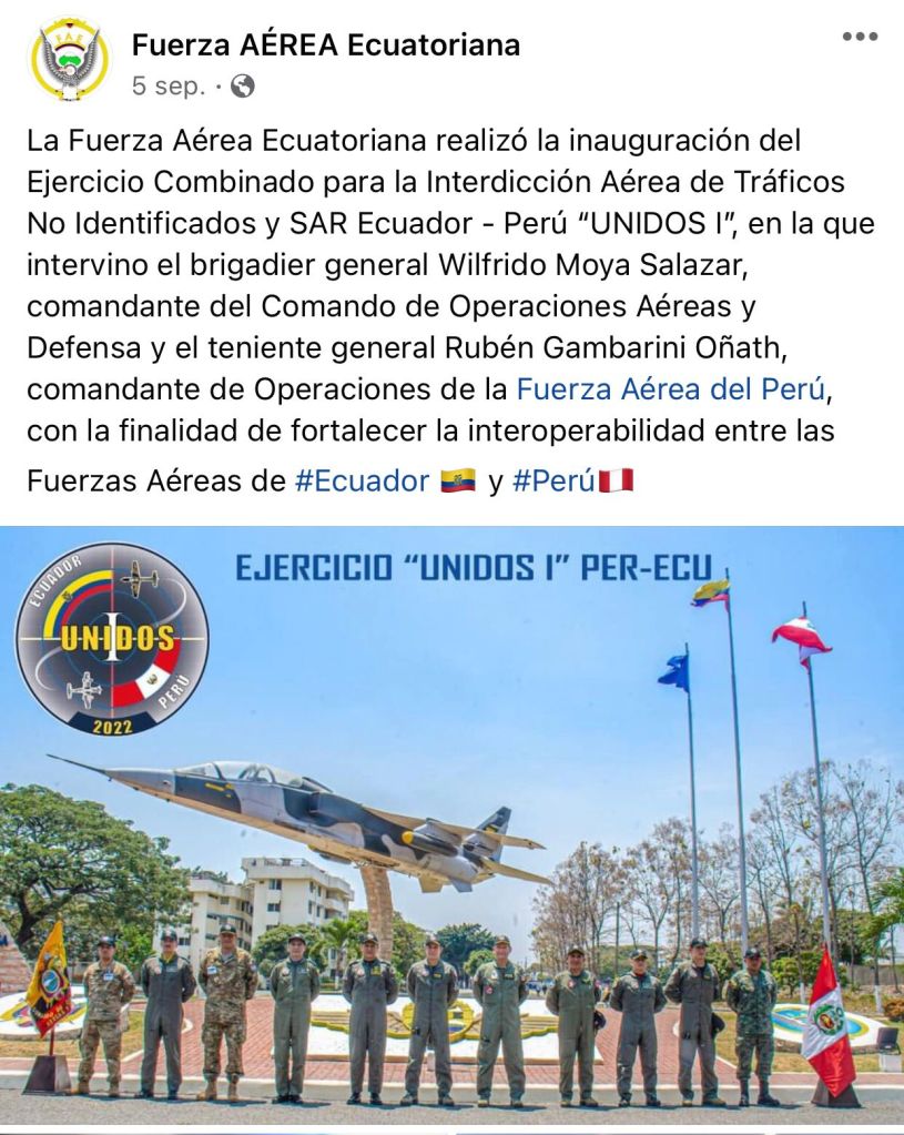 1. Ecuador-Colombia, denominado ANDES III, cumplido en MAYO del 2022, con la «finalidad simular misiones de interdicción aérea para fortalecer técnicas, tácticas y procedimientos, permitiendo la estandarización entre ambos países para actuar de manera eficaz ante las organizaciones criminales que infringen el espacio aéreo fronterizo, con fines ilegales«.
