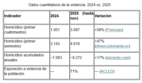 - Ministerio del Interior del Ecuador. (2025). Estadísticas de homicidios intencionales y criminalidad organizada. Gobierno del Ecuador.