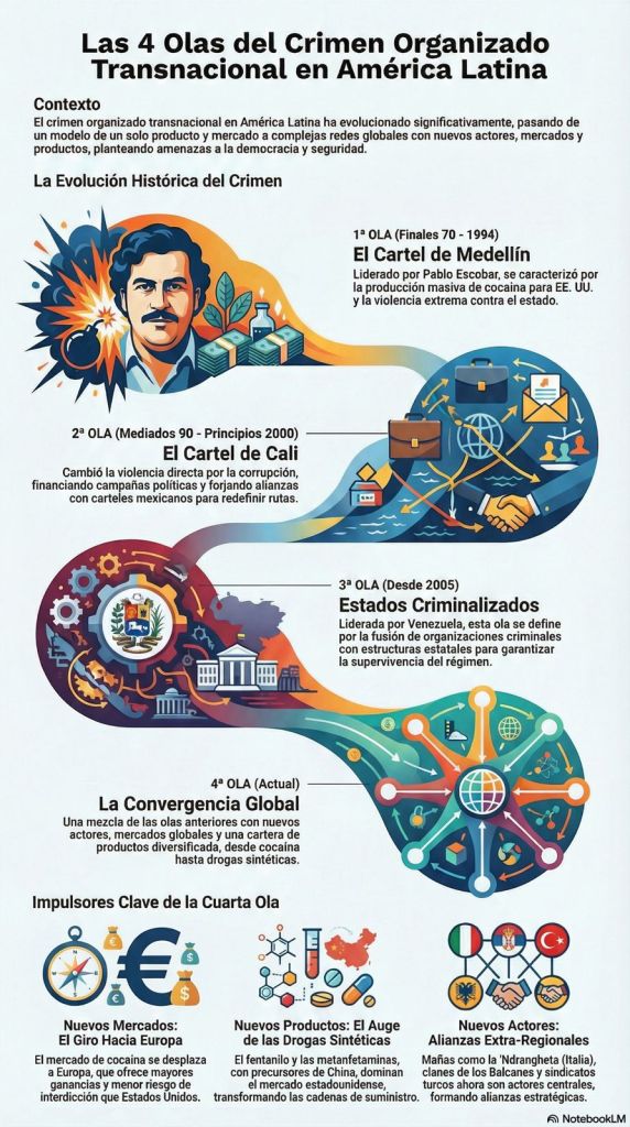 La cuarta ola es un ecosistema de alta complejidad que ha diversificado productos, mercados y actores, utilizando no solo a un Estado, sino al conjunto de ellos para sus acciones delictivas. En efecto, empleando una analogía política, se puede afirmar que se trata de un multilateralismo criminal que opera de manera eficiente.
