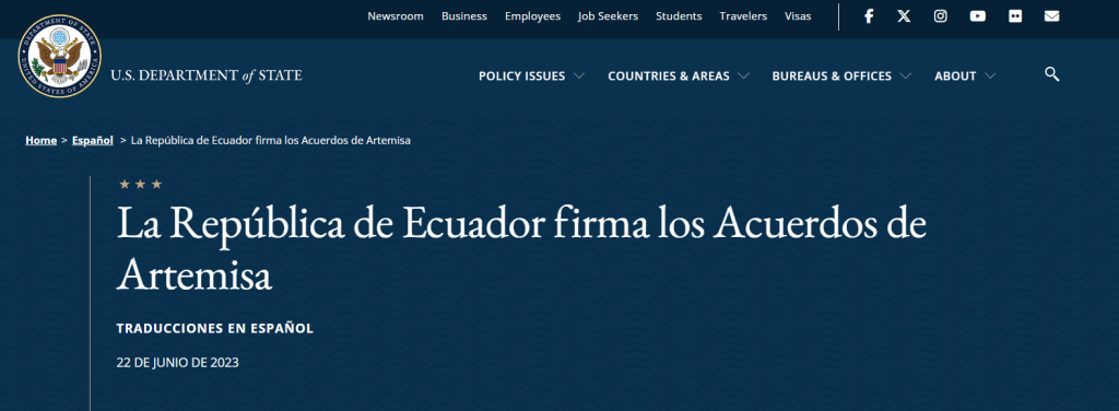 Instrumento del cual el Ecuador forma parte desde el 22 de junio de 2023, convirtiéndose en el vigésimo sexto país en firmar estos Acuerdos. Estos fomentan las actividades en la Luna, Marte, cometas y asteroides, incluidas sus superficies y subsuperficies, así como también en la órbita de la Luna o de Marte, en los puntos lagrangianos del sistema Tierra-Luna, y en tránsito entre estos cuerpos celestes y ubicaciones.
