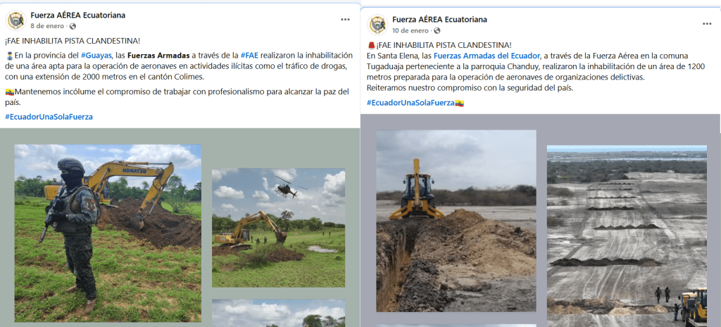 La Fuerza Aérea Ecuatoriana ha desplegado sistemas ISR mediante aeronaves tripuladas y no tripuladas, ha incrementado su cobertura radar y ha participado en la detección de rutas ilícitas, pistas clandestinas y tráfico aéreo no identificado. De acuerdo con información abierta, se han inhabilitado 36 pistas clandestinas en zonas sensibles como Esmeraldas, Guayas y Sucumbíos. El componente aeroespacial se complementa con una proyección futura que aspira al desarrollo de capacidades satelitales, interoperabilidad digital y ciberdefensa activa, como parte de una modernización estratégica.