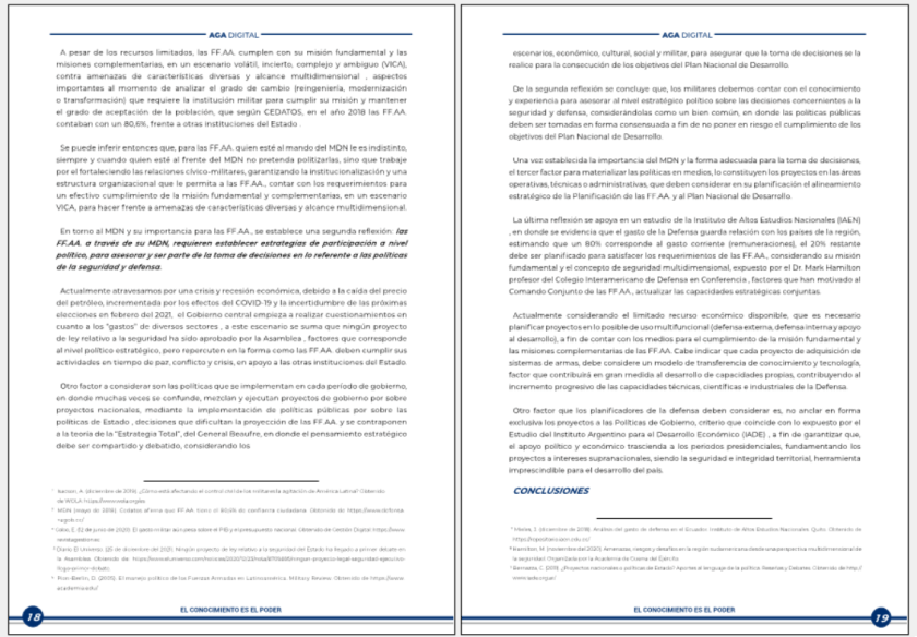 [4] Cobo, E. (12 de junio de 2020). El gasto militar aún pesa sobre el PIB y el presupuesto nacional. Obtenido de Gestión Digital: https://www.revistagestion.ec