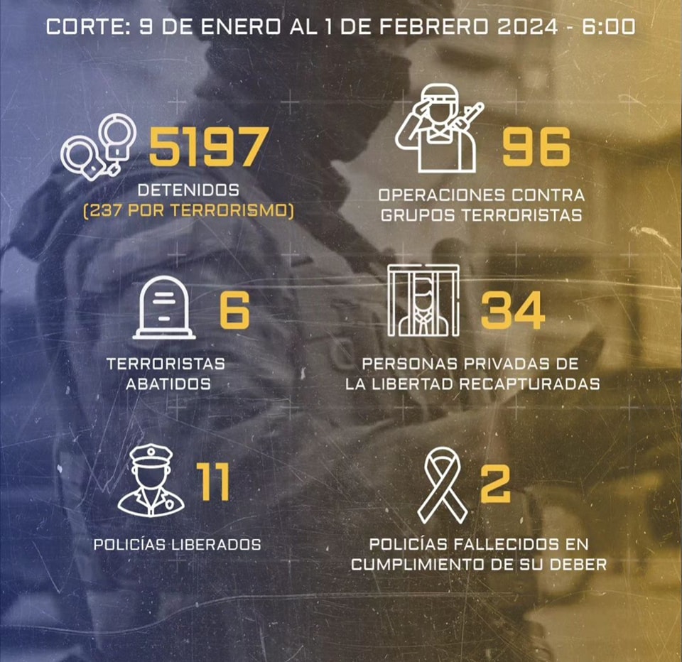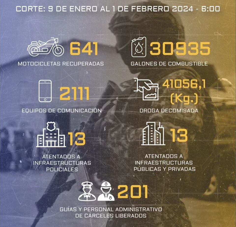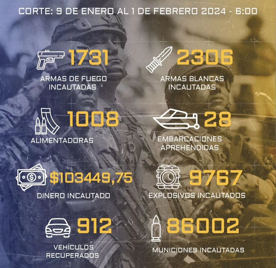 Con la declaración de “conflicto armado interno”, las Fuerzas Armadas se encuentran permanente realizando operaciones militares a nivel nacional, del 09 al 27 de enero estos son los resultados:
