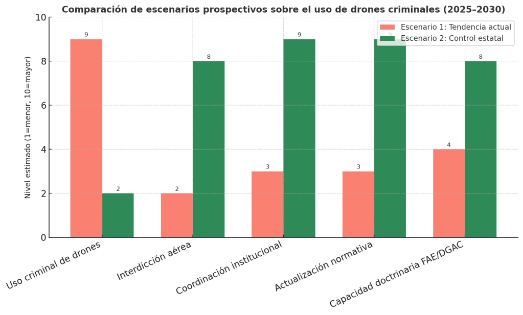Con base en este diagnóstico, se diseñaron dos escenarios prospectivos contrastantes a cinco años (2025–2030): el primero representa la tendencia actual, con bajo control estatal y expansión del uso criminal de drones; el segundo propone un escenario de control estatal efectivo, con capacidades fortalecidas, normativa actualizada y coordinación interinstitucional. Los niveles de cada variable en ambos escenarios se estimaron cualitativamente en una escala de 1 a 10, en función de su evolución probable y deseable, permitiendo representar visualmente las brechas y oportunidades estratégicas. Este enfoque facilita una lectura estructurada del futuro posible y del futuro preferido, útil para la toma de decisiones en seguridad y defensa.