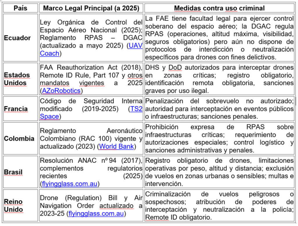 En Ecuador, el marco legal vigente ofrece algunas herramientas, pero también evidencia vacíos. La Ley Orgánica de Control del Espacio Aéreo Nacional (2025) otorga a la Fuerza Aérea Ecuatoriana (FAE) la competencia sobre la defensa y soberanía del espacio aéreo. La DGAC regula la operación civil de drones a través de un reglamento técnico para RPAS. Sin embargo, esta normativa no contempla escenarios de uso criminal ni medidas de disuasión, detección o interdicción.