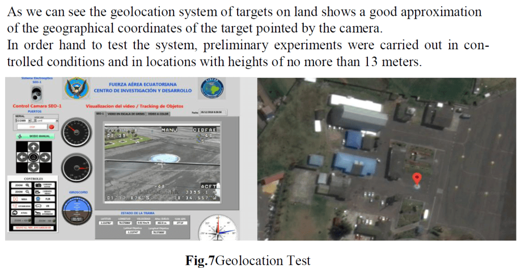 This paper presents the progress of a research work that seeks to de-termine the geographic coordinates of an object on land of interest by applying the Denavit-Hartemberg methodology to the surveillance and recognition sys-tem developed in the CID-FAE SEO-D1, this together with mathematical carto-graphy will provide information in support of military operations. The results shown in the simulation present a good approximation of the geographic coor-dinates of interest. In the light of the above, it is suggested that this kind of study provides a low-cost surveillance and reconnaissance alternative to exist-ing advanced systems such as satellites for countries that do not have this type of technology, as is the case of Ecuador.