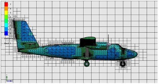 La calidad de mallado es uno de los parámetros que influyen en los resultados de las simulaciones, ya que a partir de ello se crean los nodos para el análisis CFD de elementos finitos de la simulación. Para el modelo planteado, se diseñó una malla basada en la curvatura con un grado de refinamiento inicial igual a tres. Su composición se aprecia en la Figura 3 en la que se puede observar en escala de colores el nivel de refinamiento. El refinamiento máximo establecido para este análisis fue de seis, y la calidad de mallado varió acorde a la ubicación en la aeronave; utilizando la malla más densa en los lugares más complejos de la curvatura del modelo CAD de la aeronave.