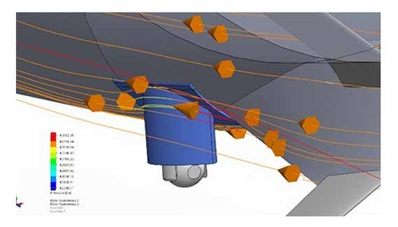 En la Figura 5 se observa cómo se orientan las líneas de fluido sobre el carenado, diseñado para reducir la fuerza de drag del sensor electróptico, que se instalará en la parte exterior del avión.