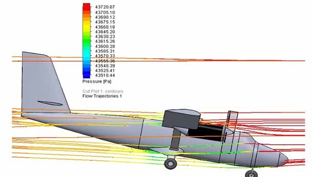 En la Figura 4 se pueden observar los resultados de la simulación en una configuración de aterrizaje sin el sensor electróptico SEO-D1, las líneas de fluido corresponden a un cambio de presión como consecuencia del impacto del aire sobre el fuselaje en la posición de descenso.