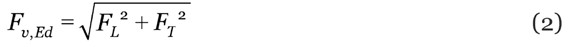 La fuerza cortante se la obtuvo encontrando el módulo del vector resultante entre la fuerza longitudinal ( FL ) y transversal ( FT ) que actúa sobre el carenado en una de las fases de vuelo críticas, como se describe en (2). Se tomaron los valores en el escenario de un vuelo crucero, como un efecto del impacto del aire sobre esa superficie y que idealmente se transmite de forma equitativa a la unión atornillada.