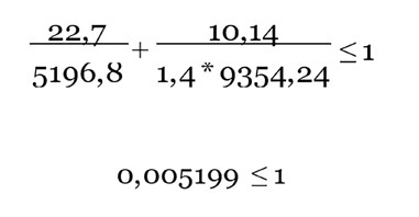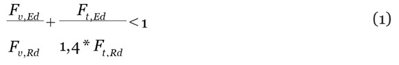 Una vez obtenidos los datos de la fuerza resistente a cortante y de la fuerza resistente a tracción de la unión atornillada, se procede a calcular si los esfuerzos provocados por las fuerzas tangentes y axiales que suf re el tornillo de manera simultánea. Los valores obtenidos en (2), (4) y (5) se reemplazan en (1) para verificar que se cumplen con las condiciones iniciales y reemplazando se obtiene lo siguiente.
