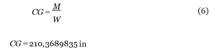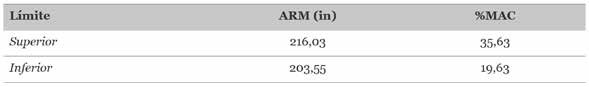 Los límites del centro de gravedad de la aeronave oscilan entre el 20% y 36%, el valor medio entre estos dos valores mínimos y máximos corresponde a un valor del 28%, que representa un brazo de palanca (ARM) medido desde el datum de 210,08 in. Se realizaron los cálculos para la sumatoria de momentos con la aeronave en vacío, tomando en consideración el peso de todo el sistema (interno y externo) se presentan en la Tabla 5 y el cálculo del CG en (6).