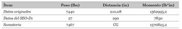 Con los parámetros encontrados en la sección anterior, se procedió a evaluar a la aeronave DHC-6 Twin Otter de la Fuerza Aérea Ecuatoriana, revisando los últimos reportes de peso y balance, a fin de que se encuentren dentro de los límites establecidos por el fabricante2. Por tanto, la instalación del sensor electro-óptico SEO-D1 tomando en cuenta los cálculos de las secciones anteriores, se presenta como resumen en la Tabla 6.