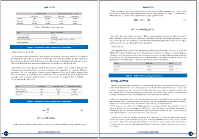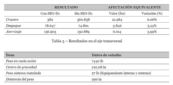27 lbs de peso a una distancia de 290 pulgadas, provoca que el centro de gravedad se mueva hacia la derecha en un porcentaje de 0,37%. Por tanto y en base a los análisis realizados, se puede asegurar que los componentes mecánicos que fueron diseñados para la instalación del SEO-D1 se acoplan de una manera eficiente en la aeronave.