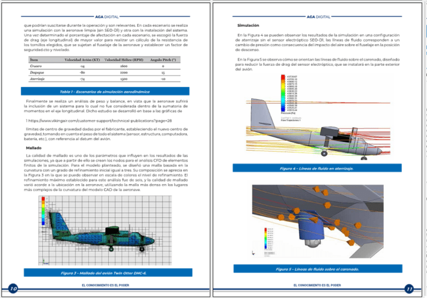 En este diseño se efectúa al análisis de afectación aerodinámica, para lo cual se dibujó el modelo de la aeronave Twin Otter en 3D, en base a las dimensiones reales que establece el fabricante en sus manuales1 (tomando en consideración el perfil alar del avión) y los escenarios de simulación se muestran en la Tabla 1. Posterior a ello, se realiza un análisis CFD (Computational Fluid Dynamics en inglés) con diferentes escenarios de simulación que podrían suscitarse durante la operación y son relevantes. En cada escenario se realiza una simulación con la aeronave limpia (sin SEO-D1) y otra con la instalación del sistema. Una vez determinado el porcentaje de afectación en cada escenario, se escogió la fuerza de drag (eje longitudinal) de mayor valor para realizar un cálculo de la resistencia de los tornillos elegidos, que se sujetan al fuselaje de la aeronave y establecer un factor de seguridad.cto y nivelado.