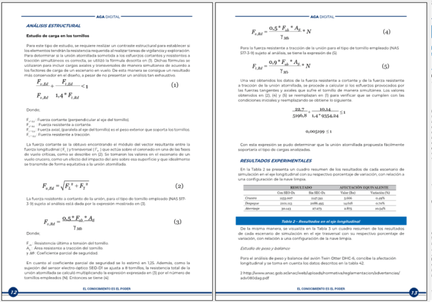 En cuanto al coeficiente parcial de seguridad se lo estimó en 1,25. Además, como la sujeción del sensor electro-óptico SEO-D1 se ajusta a 8 tornillos, la resistencia total de la unión atornillada se calculó multiplicando la expresión expresada en (3) por el número de tornillos empleados (N). Entonces se tiene (4):