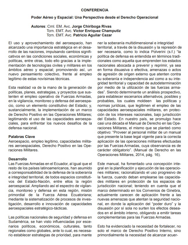 Palabras Clave: Aeroespacio, pensamiento colectivo, Derecho Positivo, capacidades aeroespaciales, bien público.