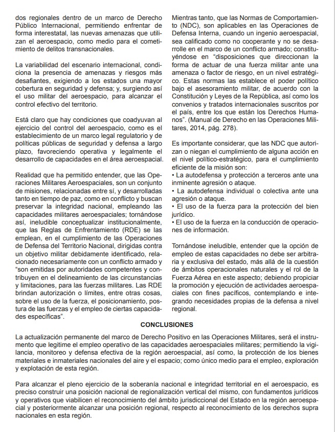 Está claro que hay condiciones que coadyuvan en el ejercicio del control del aeroespacio, como es el establecimiento de un marco legal regulatorio y de políticas públicas de seguridad y defensa a largo plazo, favoreciendo operativa y legalmente el desarrollo de capacidades en el área aeroespacial.