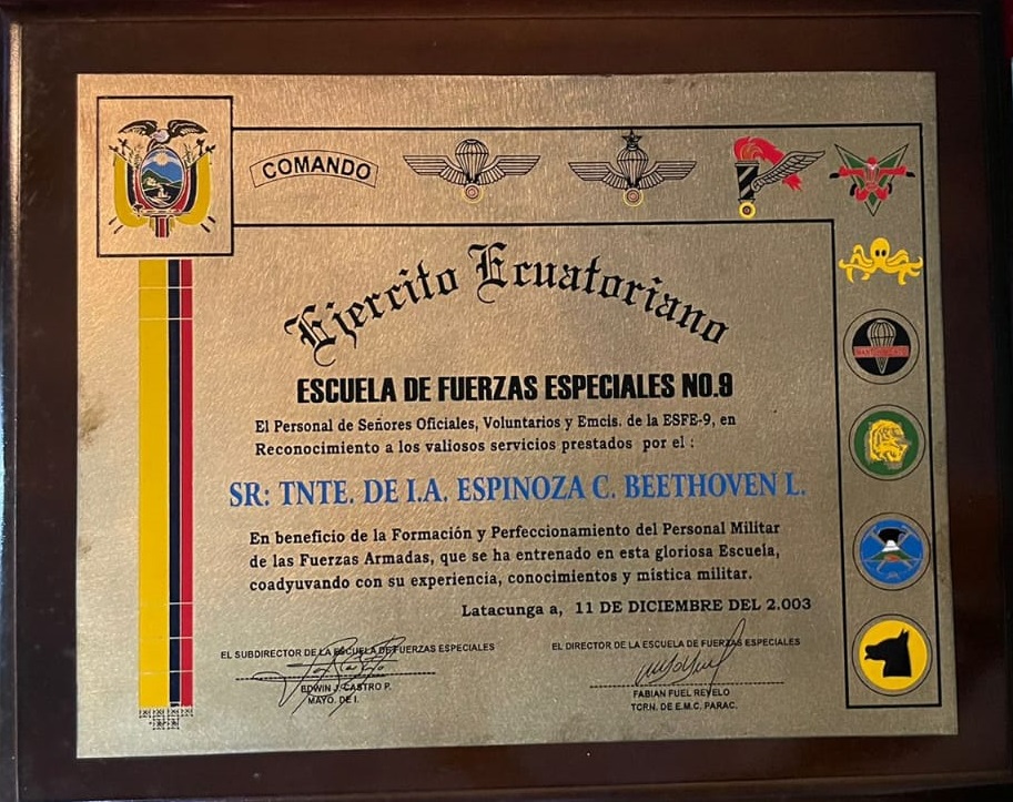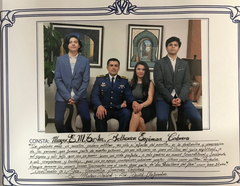 «Un peldaño más en nuestra carrera militar, no sólo es esfuerzo del suscrito, es la dedicación y comprensión de las personas que forman parte de nuestro entorno, por eso este curso va para mi Dios, mi guía espiritual, a mi esposa y mis hijos que con su amor hace mi vida perfecta, a mis padres su amor incondicional y finalmente a mis compañeros y Buddys, pues con su apoyo conseguimos culminar nuestro último curso militar. Por dentro siempre seremos los mismos jóvenes ilusionados con el sueño de ser parte de Los Caballeros del Aire, como hace 27 años.»