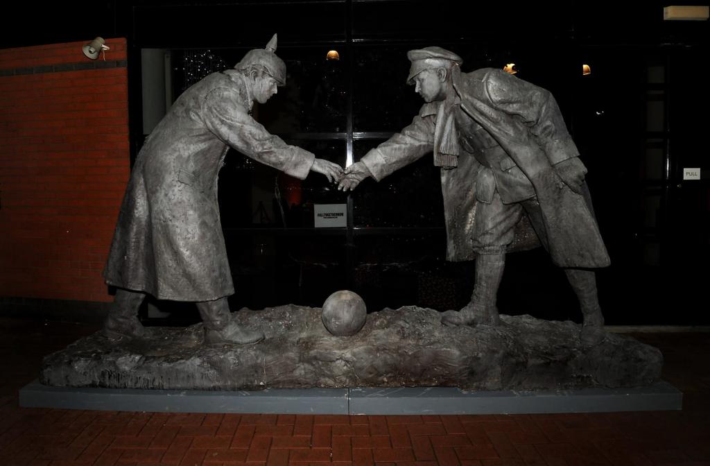 Escultura conmemorativa de la Tregua de Navidad 1914, se exhibe en la recepción del Estadio Britannia. La escultura del artista Andy Edwards de Stoke, titulada «All Together Now».
